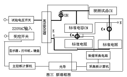 TPJSC系列智能化抗干擾介質(zhì)損耗測試儀測量線路包括一路標準回路和一路測試回路,如圖三所示。標準回路由內(nèi)置高壓穩(wěn)定度標準電容器與標準電阻網(wǎng)絡(luò)組成,由計算機實時采集標準回路電流與測試回路的電流幅值及其相位差,并算出被測試品電容容值(CX)和介質(zhì)損耗(tgδ)。
