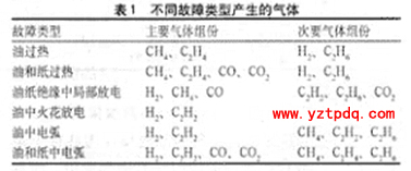 運(yùn)行變壓器內(nèi)常發(fā)生的氣體故障主要有過(guò)熱性故障和放電故障兩大類(lèi),故障類(lèi)型及其能量密度,主要決定于故障的性質(zhì),不同故障類(lèi)型產(chǎn)生的氣體見(jiàn)表1。