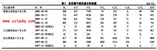 武漢供電局曾對(duì)局轄珞珈山變電站3號(hào)主變、江漢路變電站1號(hào)主變和花山變電站1號(hào)主變進(jìn)行周期取樣或事故取樣,并用TPSPY-Q氣相色譜儀對(duì)其進(jìn)行分析,其數(shù)據(jù)見(jiàn)表2。