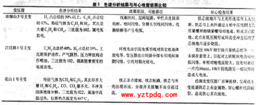 珞珈山3號(hào)主變、江漢路1號(hào)主變和花山1號(hào)主變的色譜分析結(jié)果、故障原因以及吊心檢查結(jié)果見(jiàn)表3。