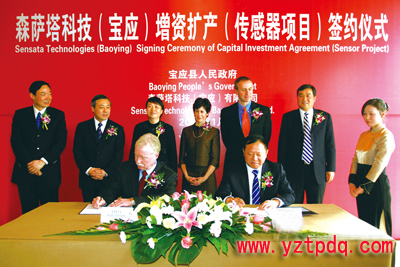 1月19日中午,美國(guó)森薩塔科技公司在揚(yáng)州與我縣簽訂增資擴(kuò)產(chǎn)協(xié)議,市委書記、市人大常委會(huì)主任王燕文,市委副書記、市長(zhǎng)謝正義,副市長(zhǎng)聞道才,森薩塔科技總裁兼首席運(yùn)營(yíng)官瑪莎·蘇利文女士,森薩塔科技執(zhí)行副總裁、首席財(cái)務(wù)官杰夫·科特先生,森薩塔科技運(yùn)營(yíng)高級(jí)副總裁迪克·丁先生,縣委書記、縣人大常委會(huì)主任仲生,縣委副書記、縣長(zhǎng)王庭國(guó),縣委副書記周玉寶,副縣長(zhǎng)顧長(zhǎng)榮以及市經(jīng)信委、商務(wù)局、質(zhì)監(jiān)局、海關(guān)、商檢局和我縣相關(guān)負(fù)責(zé)人等出席簽約儀式。