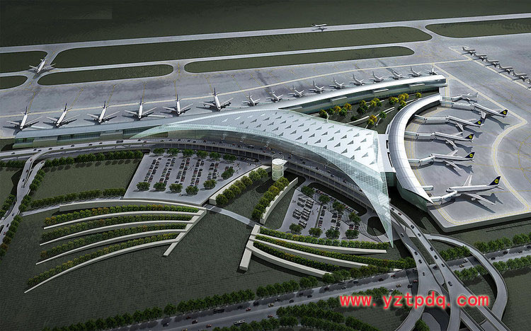 在機場航站樓效果圖上,作者發(fā)現航站樓平面形狀為扇形,地上二層,屋面為雙螺旋曲面構造體系。據介紹,機場航站樓由美國蘭德隆與布朗有限公司設計,建筑造型新穎,采用鋼結構屋面,為斜交網格結構,具有三維動感立體視覺效果。在機場航站樓前,是一個半月形的人工湖。“月光下的一彎‘藍月’,像一面明鏡特別迷人,體現出‘天下三分明月夜,二分無賴是揚州’的月亮文化特色。”施工人員介紹說。