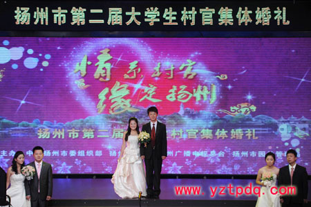 2011年10月18日,由揚州市委組織部、市婦聯(lián)、市廣電總臺、市園林管理局等單位聯(lián)合主辦的揚州市第二屆大學(xué)生村官集體婚禮在廣電中心演播廳隆重舉行,15對大學(xué)生村官“情系村官、緣定揚州”集體成親。市委常委、組織部部長丁純親臨現(xiàn)場,為大學(xué)生村官新人證婚。