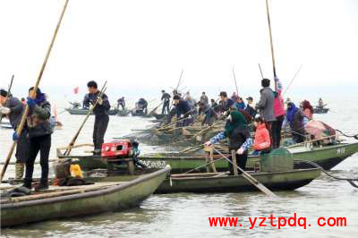 當天上午9時,齊聚邵伯湖畔的漁民舉行了古老的漁家祭祀湖神儀式。沿湖村德高望重的長者、漁家傳承人黃蘭玉宣布“殺圍”節(jié)開始。