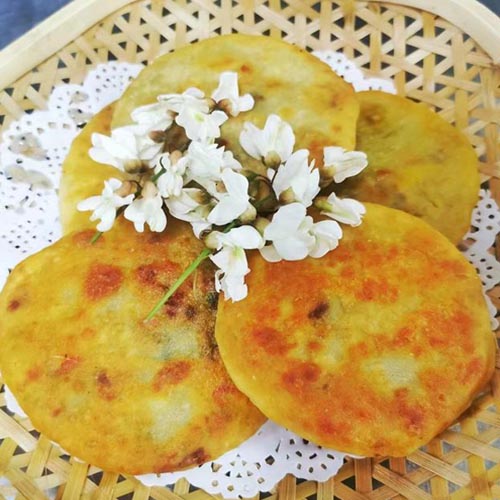 昨天 恰巧看到有人拿竹竿打下了好多槐花,我統(tǒng)統(tǒng)買了回來,足有8斤多!回來后請廚師用清水洗凈,用鹽水浸泡,揉面焯水,裹調拍打成形,兩面煎烤,一塊塊槐花餅受熱膨脹,香氣四溢!不由得垂涎滴襟腸肚慌,眾人爭相把餅嘗。咬一口松軟彈牙,嚼著嚼著清香可口,唇齒間留住了春天的味道,妙不可言!淡淡的槐花和雞蛋的香味,讓你的味蕾綻放開來,那種焦、香、酥、脆的感覺會讓你久久不能忘懷!嚼著嚼著,眼前浮現(xiàn)童年時的光景,小河脈脈,蛙聲四起。也許這種悠長的懷念,就是鄉(xiāng)愁!